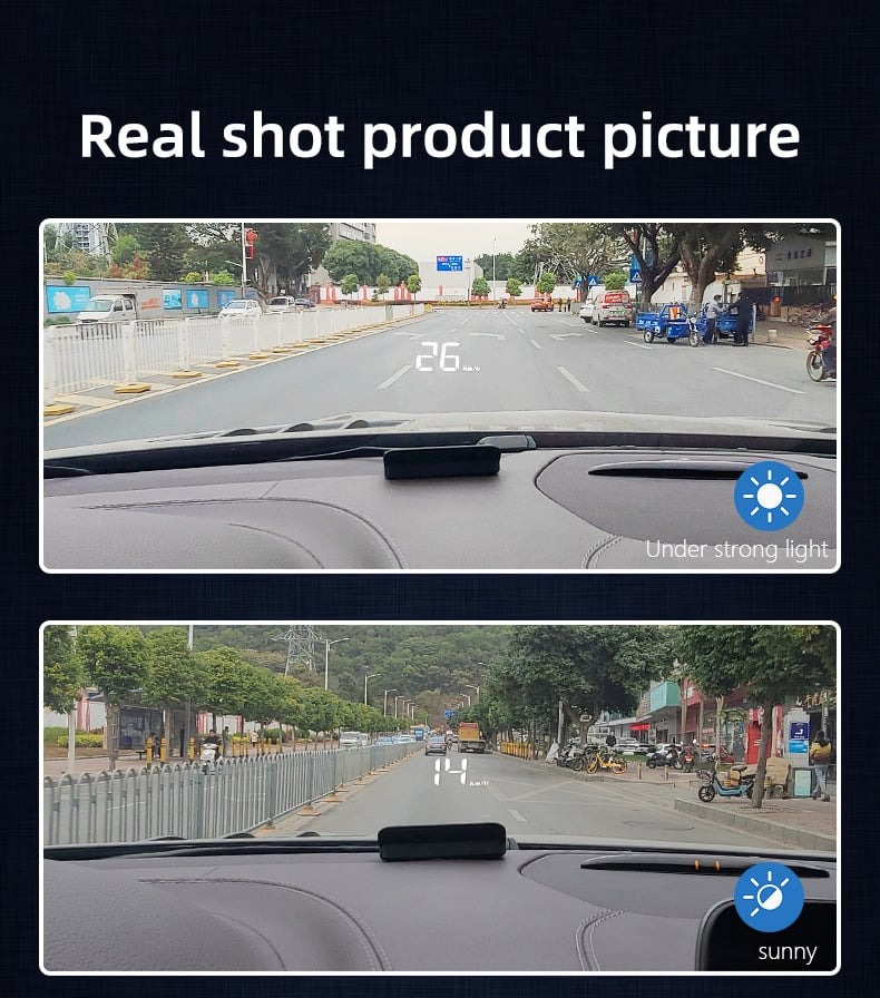 Multi-function: Heads up display can display vehicle speed, water temperature, voltage, one-way mileage. With alarm function, overspeed alarm, water temperature alarm, voltage alarm, fatigue driving reminder, fault alarm. HUD has an adaptive light sensor function, with clear backlight during the day and soft and glare- at night.